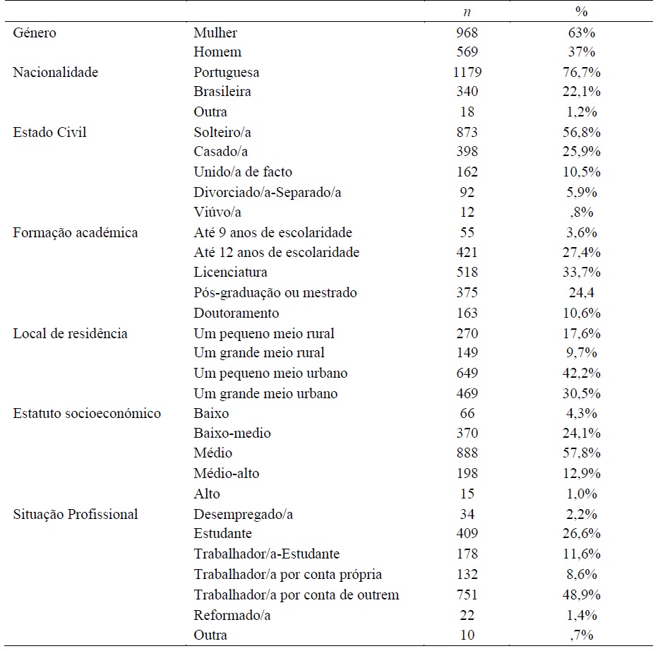 Participaram neste estudo 1537 indivíduos, com uma média de idades de 33,54 anos (DP: ± 12,88), variando entre os 18 e os 74 anos. A maioria dos participantes são mulheres (63%), portugueses (76,7%), solteiros (56,8%), pertencentes a um estatuto socioeconómico médio (57,8%) e residentes em meio urbano (72,7%). Trata-se de uma amostra diferenciada, dado que 68,7% apresenta formação académica universitária e 69,1% encontra-se profissionalmente ativa, integrada no mercado de trabalho. Todas estas características sociodemográficas podem melhor ser observadas no Quadro 1.