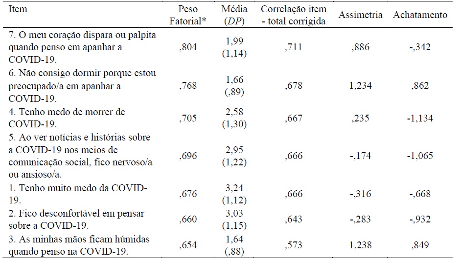 A partir do resultado da análise paralela optou-se por realizar uma nova extração forçada a apenas um fator. O peso fatorial de cada item pode ser verificado no Quadro 3. Os valores de assimetria e achatamento encontram-se dentro dos parâmetros aceitáveis (-/+ 2), sugerindo a normalidade da distribuição (George & Mallery, 2019). A escala unifatorial, comportando os 7 itens, apresenta um valor de alfa de Cronbach de ,87, indicando uma boa consistência interna. Os itens, presentes no Quadro 3, representam assim o fator designado por medo à Covid-19.
