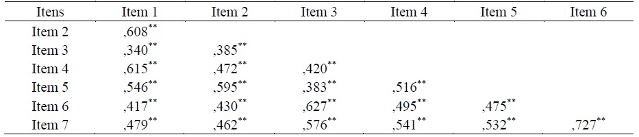 Como se pode observar no Quadro 4, o coeficiente de correlação de Pearson verificado na correlação entre os itens é superior a ,30, o que fornece evidência adicional à validade da escala (Robinson et al., 1991).