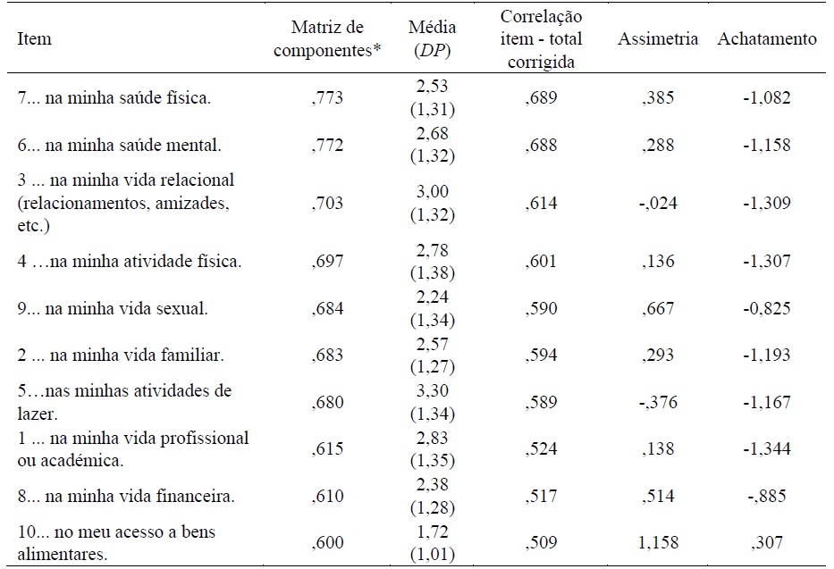 As características psicométricas dos 10 itens, analisados numa única componente, podem ser verificadas no Quadro 6.