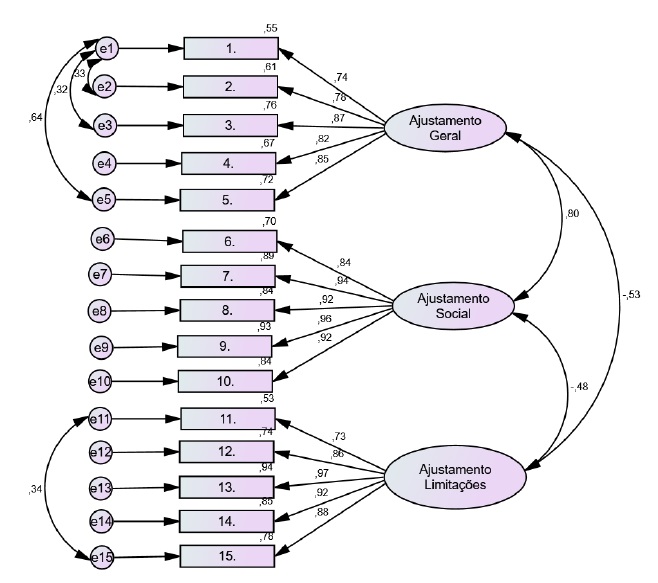 Foi realizada uma análise fatorial confirmatória (CFA), de acordo com a estrutura original, ou seja, um modelo com três fatores para as Escalas de Ajustamento Psicossocial e um fator unidimensional para a Escala de Restrição nas Atividades. A solução de três fatores nas Escalas de Ajustamento Psicossocial apresentou bons índices de ajustamento, χ2/gl=1,80, p<0,001; GFI=0,893; AGFI=0,845; CFI=0,972; RMSEA=0,075, assim como a solução unidimensional da Escala de Restrição nas Atividades, χ ²/gl=1,43, p=0,192; GFI=0,978; AGFI=0,933; CFI=0,995; RMSEA = 0,054. Todos os itens saturaram significativamente nos fatores originais, p<0,001, com saturações acima de 0,50, e a maioria das correlações entre itens e fatores revelaram-se fortes (0,73 a 0,97) (figuras 1 e 2). Porém, tanto na escala de Ajustamento Geral como na Escala de Ajustamento às Limitações, foram permitidas correlações entre pares de itens (entre os itens 1 e 2; 1 e 3; e 1 e 5 na escala de AG; e entre os itens 11 e 15 na escala de AL). Na Escala de Restrição nas Atividades, os itens 7, 8, 9 e 10 foram excluídos. Para além disso, os índices de modificação (IM) indicaram que a extensão do qui-quadrado melhoraria se os parâmetros restritos fossem covariados e, como esses itens possuíam semelhanças de conteúdo, permitiu-se a correlação entre erros no mesmo fator (entre os itens 2 e 5 e entre 4 e 5) (figuras 1 e 2).