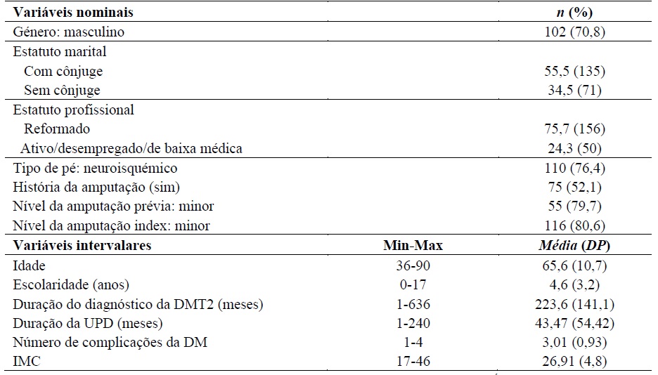 Cento e quarenta e quatro pacientes foram avaliados um mês após a amputação. O quadro 1 apresenta as características sociodemográficas e clínicas da amostra. Todos os participantes apresentavam Diabetes Mellitus Tipo 2 (DMT2) e UPD, e 52,1% (n=75) já tinham sido submetidos a uma amputação prévia.