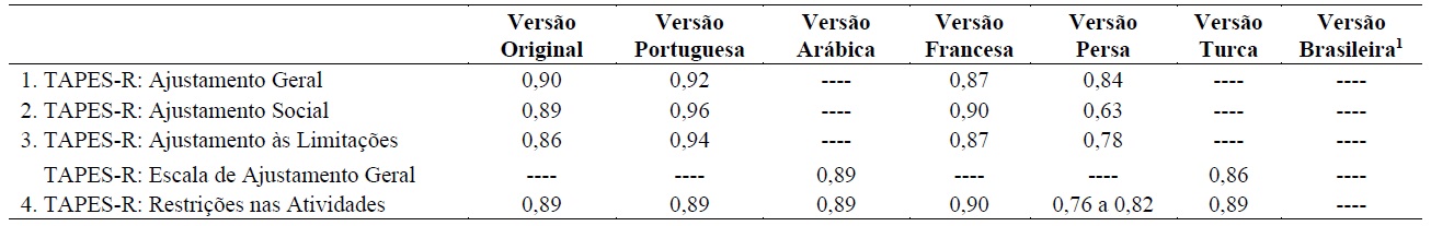 A versão da TAPES-R-PT apresentou propriedades psicométricas adequadas em todas as escalas tal como a versão original. Os alfas de Cronbach do presente estudo são apresentados no quadro 2 juntamente com os alfas das demais versões validadas (Tapes-R-PT é apresentada como material suplementar).
