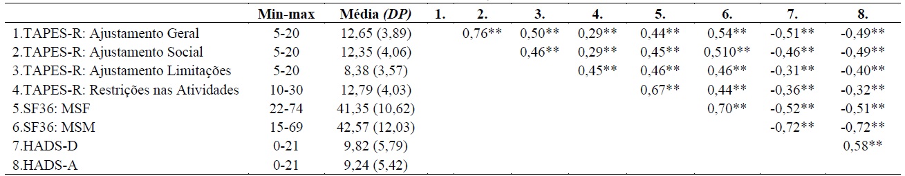 O quadro 3 apresenta os valores da estatística descritiva e do coeficiente de correlação de Pearson entre as escalas da TAPES-R-PT, medidas sumárias do SF-36 e escalas do HADS.