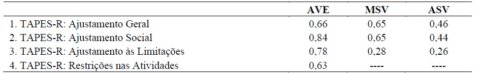 Os valores da variância média extraída (AVE) e a variância máxima e média quadrada compartilhada (MSV/ASV) revelaram-se adequados (quadro 4).