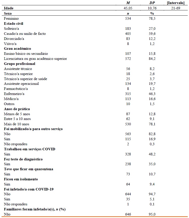 O presente estudo é quantitativo, descritivo-correlacional, transversal. A amostra ficou constituída por 680 PS do CHUC, 78,5% (n = 534) do sexo feminino. A média de idades foi de 45,05 (DP = 10,76). A maioria era casado/a ou vivia em união de facto (n = 405; 59.6%) e possuía Licenciatura ou grau académico superior à Licenciatura (n = 572; 84,2%). Quanto ao grupo profissional, 46,3% dos profissionais era enfermeiro/a(s) (n = 315), 19,7% assistentes operacionais (n = 134) e 16,6% médico/a(s) (n = 113). A maioria dos profissionais tinha mais de 10 anos de prática profissional (78,1%; n = 530).