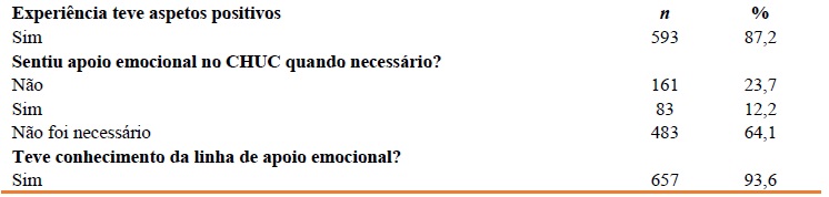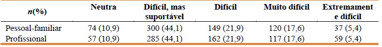 Nesta primeira vaga da pandemia (março a junho de 2020), a maioria (83,0%) do/a(s) PS não foi mobilizado para outro serviço (n = 563). Apesar da maioria (51,8%; n = 352) não ter trabalhado em serviços COVID, 48,2% acabou por fazê-lo (n = 328). A maioria (65%; n = 442) não realizou teste de diagnóstico, nem teve de ficar de quarentena (89,3%; n =607) ou em isolamento (90,6%; n = 616). Apenas 35 PS (5,2%) ficaram infetado/a(s) com COVID-19 e a maioria não teve familiares infetado/a(s) (95%; n = 646) (Quadro 1). Igualmente, a maioria classificou a sua vivência da pandemia, a nível pessoal-familiar e profissional como difícil, mas suportável (respetivamente, n = 300; 44,1%; n = 285; 44,1%) (Quadro 2). Porém, a generalidade (87,2%; n = 593) considerou que a experiência vivida durante os primeiros meses da pandemia teve aspetos positivos. Da mesma forma, a maioria não entendeu ser necessário receber apoio emocional por parte do CHUC (n = 483; 64.1%), mas entre os que sentiram essa necessidade, 23,7% (n = 161) referiu não ter sentido apoio institucional. A quase totalidade (93,6%; n = 657) do/a(s) PS tomou conhecimento da linha de apoio emocional que foi criada para apoiá-los (Quadro 3).