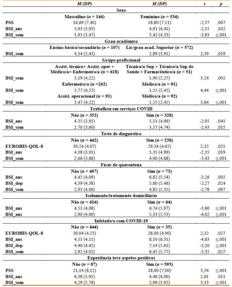 Igualmente, PS que trabalharam em serviços COVID relataram maior somatização e ansiedade (efeitos pequenos/ղ2 = 0,01). Adicionalmente, PS que fizeram teste COVID apresentaram menor qualidade de vida e maior ansiedade e somatização (efeitos pequenos; respetivamente, ղ2 = 0,01; 0,01 e 0,02). Já PS que tiveram de ficar em quarentena ou isolamento relataram maior ansiedade (efeitos pequenos/ղ2 = 0,02) e somatização (efeitos pequenos/ղ2 = 0,01 e 0,03, respetivamente) [o/a(s) que ficaram de quarentena também expressaram maior depressão; efeito pequeno/ղ2 = 0,01]. O/a(s) PS que ficaram infetado/a(s) relataram menor qualidade de vida (efeito pequeno, ղ2 = 0,01), mas maior ansiedade (efeito pequeno, ղ 2 = 0,02), somatização (efeito pequeno, ղ2 = 0,01) e depressão (efeito pequeno, ղ2 = 0,01). O/a(s) PS que consideraram existir aspetos positivos na vivência da pandemia vivenciaram menor stress percebido, ansiedade e somatização (efeitos pequenos; respetivamente, ղ2 = 0,02, 0,01 e 0,02)