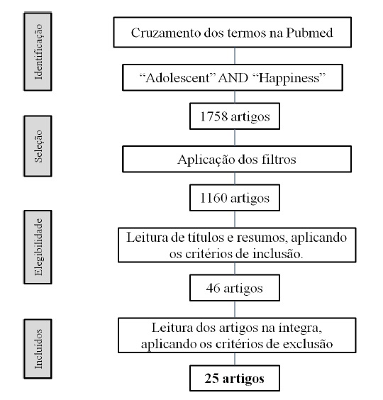 Na primeira fase (identificação) buscou-se os registros na base de dados da MEDLINE através do cruzamentos dos descritores “Adolescent” AND “Happiness”, com a finalidade de resgatar na literatura o que tem sido apresentado sobre a temática da felicidade na adolescência. Na segunda fase (seleção), aplicaram-se os filtros: idiomas (inglês, português e espanhol) e ano de publicação (entre julho de 2009 e julho de 2019). A última fase (elegibilidade) foi realizada em duas etapas, que incluíram a leitura dos títulos e resumos, e posteriormente a leitura dos artigos na íntegra. Os títulos e resumos foram analisados de acordo com os seguintes critérios de inclusão: a) artigos que abordassem fatores associados à felicidade na adolescência; b) pesquisas cuja amostra incluíssem a faixa etária entre 10 e 19 anos.
