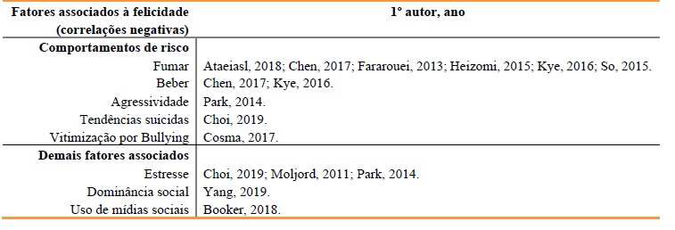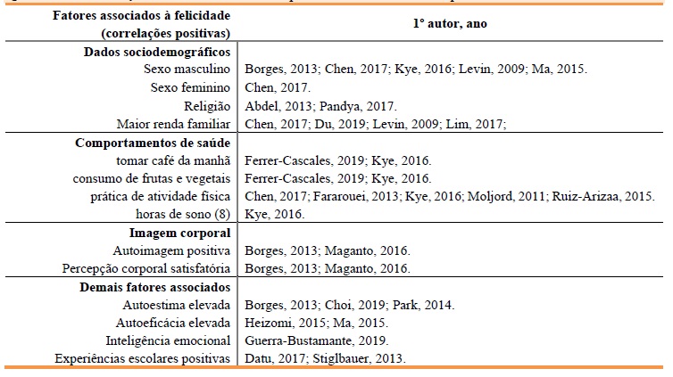 As características dos estudos que apresentam a felicidade através de correlação positiva são, em sua maioria, sexo masculino, ter religião, maior renda familiar, condutas de saúde, autoimagem e percepção corporal positivas, autoeficácia e autoestima elevada, comportamento pró-social, inteligência emocional e experiências escolares positivas (Quadro 1).