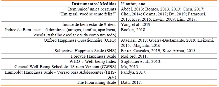 Quanto aos instrumentos utilizados foram encontradas diferentes maneiras de avaliar a percepção da felicidade entre os adolescentes. Em sua maioria, os estudos se utilizaram da avaliação através de único item/pergunta que busca considerar de maneira geral como o indivíduo avalia sua própria vida. Uma medida de felicidade de item único serve como um indicador confiável e válido de bem-estar subjetivo na população em geral e está altamente correlacionada com medidas e escalas mais complexas, como por exemplo o Oxford Happiness Inventory e a Satisfaction with Life Scale (Diener et al., 1999). A escala Oxford Happiness Questionnaire (OHQ) também esteve entre os instrumentos mencionados. A mesma avalia a felicidade subjetiva a partir de dimensões psicológicas, que incluem itens de satisfação com a vida, emoções positivas, saúde física, mental e relações sociais (Guerra-Bustamante et al., 2019) (Quadro 3).