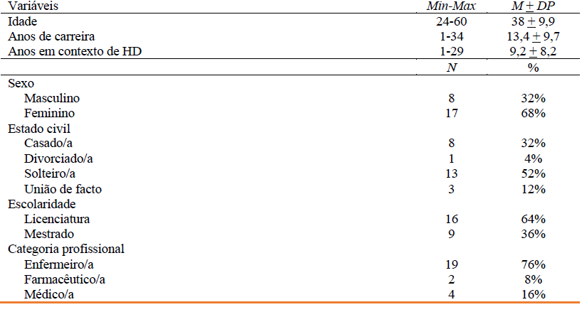Foram recrutados 25 profissionais essencialmente a partir de um centro de hemodiálise na zona Norte do país. Para serem incluídos no estudo, os participantes tinham de: (i) ser profissionais de saúde; (ii) trabalhar há pelo menos 12 meses em contexto de cuidados de saúde em HD; e (iii) aceitar participar voluntariamente. Estabeleceu-se como critério de exclusão o diagnóstico clínico de depressão no momento do estudo.