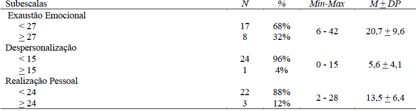 No que toca à avaliação do burnout, o instrumento utilizado foi o Maslach Burnout Inventory (MBI), que compreende 22 itens distribuídos por três subescalas: (i) Exaustão Emocional (EE), que se refere à falta de energia, entusiasmo e sensação de esgotamento de recursos; (ii) Despersonalização (DP), que diz respeito ao distanciamento e indiferença em relação ao outro; e (iii) Realização Pessoal (RP), que, diminuída, se refere ao decréscimo da produtividade e ao sentimento de incompetência ou ineficácia em relação ao trabalho (Maslach & Jackson, 1981). A versão utilizada neste estudo foi a adaptada para a população portuguesa por Mota-Cardoso e colaboradores (2002), que considera a existência da síndrome mediante pontuações > 27 na EE; > 15 na DP; e > 24 na RP.