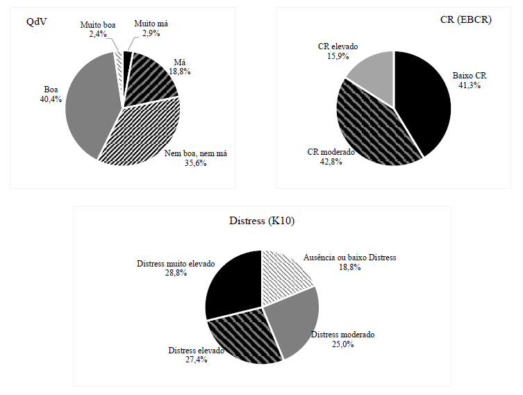 No que diz respeito à QdV, 42,8% reporta como sendo boa ou muito boa e 35,6% como nem boa, nem má. Por outro lado, 21,7% dos inquiridos descrevem a sua QdV como má, ou muito má. Já em termos de CR, apenas 15,9% apresenta níveis adequados. Relativamente ao distress, 56,3% dos inquiridos apresenta níveis enquadrado em nível de sintomas com significância clínica (Figura 1).