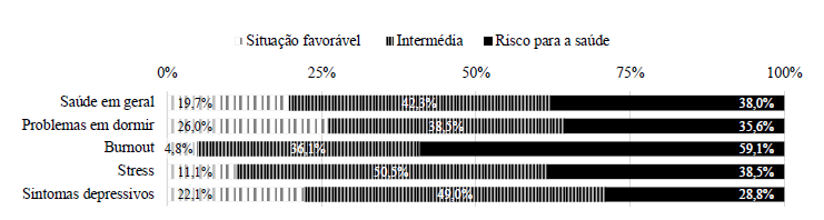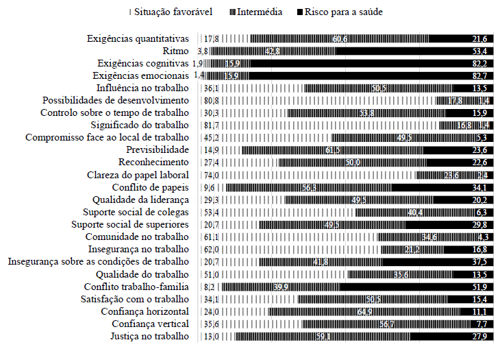 Considerando resultados dos FRPs, quando interpretados em proporção dos percentis tripartidos (impacto na saúde que a exposição representa), apenas sete (das 25 subescalas/ FRPs avaliados), apresentaram taxas superiores a 50% de situação favorável, destacando-se as subescalas de Possibilidades de desenvolvimento, Significado no trabalho, bem como Clareza do papel laboral. Por sua vez, os valores mais elevados de risco para a saúde são encontrados na dimensão de EL, particularmente, nas subescalas de Exigências Cognitivas e Emocionais, nas quais os respondentes apresentavam uma situação de risco para a saúde, com taxas superiores a 75% (Figura 3).