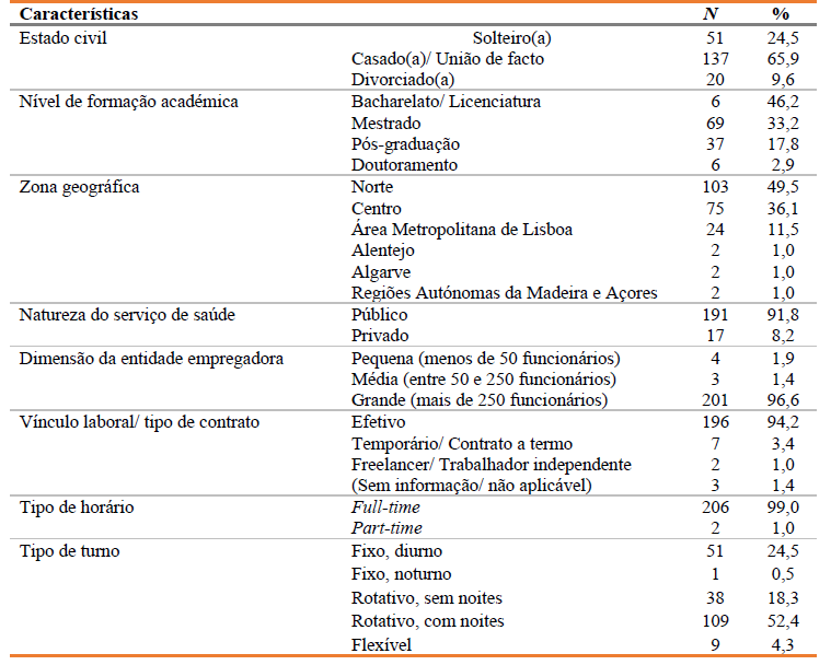 O estudo empírico contou com a participação de 208 Enfermeiros, dos serviços de saúde portugueses de natureza privada (8,2%) e pública (91,8%). A amostra incluiu 162 participantes do género feminino e 46 do género masculino, com idades compreendidas entre 22 e 65 anos (M= 43,41, DP=10,281). Todos os dados sociodemográficos podem ser verificados no Quadro 1.