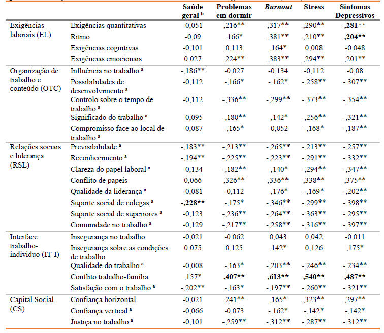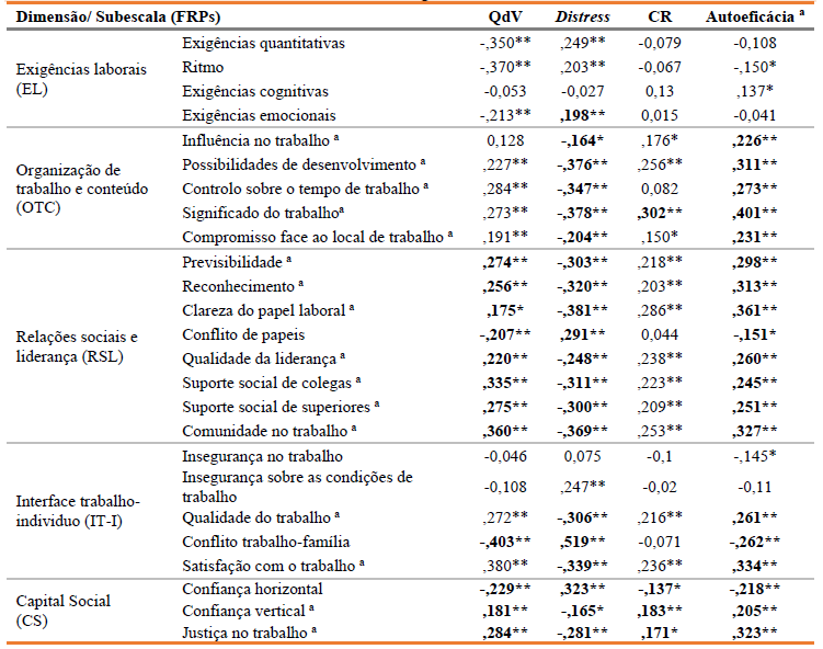 Ao nível da Saúde e bem-estar (Quadro 3, Anexo 09), a subescala Saúde em geral é aquele que apresenta menos correlações com o FRPs. Destaca-se a correlação positiva mais alta com o FRP Conflito trabalho família (r= ,157, ρ≤0.01) e negativa com Suporte social de colegas (r= -0,228, ρ≤ 0,01). Já no domínio Problemas em dormir, verifica-se correlações estatisticamente significativas com a dimensão OTC, sendo a correlação mais forte encontrada com o FRP de Conflito trabalho família (r= ,407, ρ≤ 0,01) da dimensão IT-I. Os domínios de Burnout, Stress e Sintomas depressivos apresentam correlações com todos os FRPs das dimensões de RSL e CS. Por sua vez, as correlações mais fortes encontradas no FRP de Conflito trabalho-família, da dimensão IT-I (Quadro 3).
