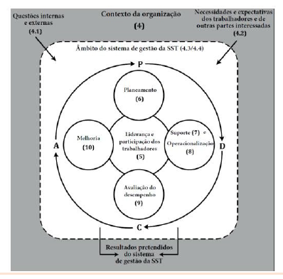 A definição, desenho e aplicação de um SGSST baseado na ISO 45001 (ISO, 2019) pressupõem a passagem à prática do ciclo de Deming, também conhecido como ciclo PDCA (Plan, Do, Check, Act) (Figura 1), permitindo uma abordagem integrada, sistemática, e iterativa aos sistemas de gestão com o objetivo geral da melhoria contínua nos processos identificados. O ciclo PDCA deverá ser aplicado ao SGSST, e a cada um dos seus elementos individuais (ISO, 2019):