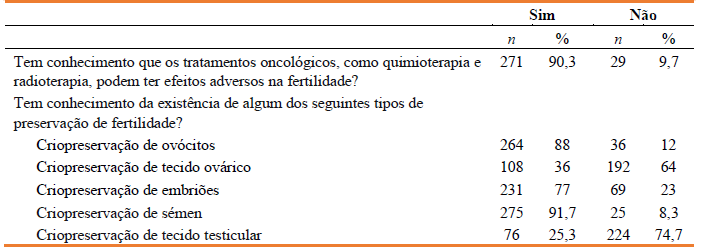 Ao serem questionados se, em caso de necessidade, saberiam onde procurar um serviço para obter mais informação sobre preservação de fertilidade, 188 (62,7%) responderam afirmativamente e 112 (37,3%) referiram desconhecer um serviço deste tipo. Adicionalmente, e no tocante ao conhecimento da legislação acerca da preservação da fertilidade em vigor em Portugal, a maioria dos respondentes (n = 256; 85,3%) indicou desconhecer este enquadramento legal e apenas 44 (14,7%) referiram conhecê-lo.