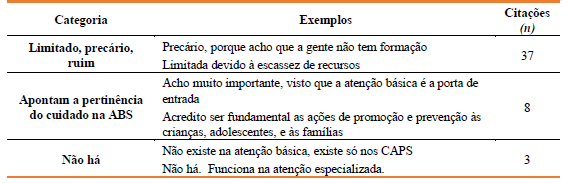 Relativo a percepção dos participantes sobre o cuidado à saúde mental infantojuvenil na ABS, a Quadro 4 apresenta os resultados: