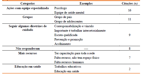 Por fim, questionou-se aos participantes o que eles consideram que poderia ser oferecido às crianças e adolescentes em sofrimento psíquico na Unidade de Saúde, conforme apresenta-se no Quadro 5. Identifica-se que as categorias mais citadas foram as ações com equipes especializadas e grupos.