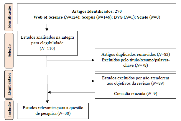 A Figura 1 apresenta o diagrama de busca e seleção dos estudos. Na fase 1 foram eliminados 160 estudos e na segunda 89, seguindo os critérios de inclusão e exclusão. Nove estudos foram incluídos na etapa de consulta, resultando em uma amostra de 30 estudos. Conforme Quadro 1, destacam-se os 30 estudos que compõem este estudo de revisão, organizados por ano de publicação, e suas principais características.