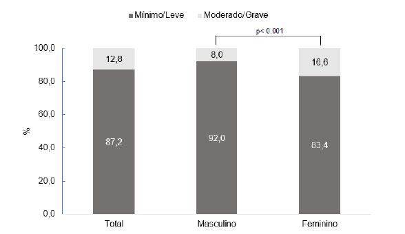 A prevalência de sintomas depressivos foi de 12,8%, sendo superior nas mulheres (16,6%) em relação aos homens (8,0%) (p< 0,001) (Figura 1).