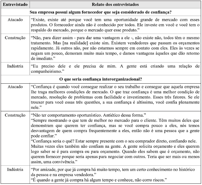 No decorrer das entrevistas, foram levantadas questões norteadoras que abordavam se a empresa do entrevistado possuía algum fornecedor considerado como de confiança, no qual a empresa podia confiar, como também foi verificado o que era confiança interorganizacional na percepção desses entrevistados. As principais falas dos entrevistados estão apresentadas no Quadro I.