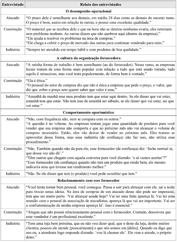 A questão central da pesquisa foi a análise das respostas sobre o que gera a confiança interorganizacional, norteada no decorrer da entrevista por aspectos levantados na literatura. Dessa forma, os seguintes pontos foram questionados: desempenho operacional do fornecedor, a cultura da organização fornecedora e o comportamento oportunístico do fornecedor, todos fundamentados no fornecedor que os entrevistados descreveram como de confiança. Além disso, foi questionado sobre como era o relacionamento entre o entrevistado e esse fornecedor, que descreveram como confiável. As respostas podem ser visualizadas no Quadro II.