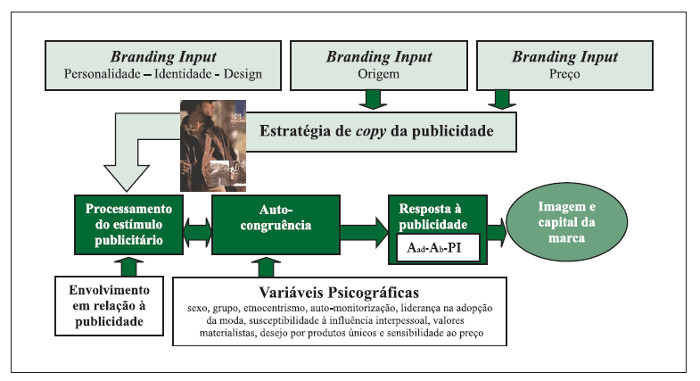 O consumidor que possui um conjunto de características sócio-demográficas e psicográficas e um determinado conhecimento prévio da categoria, é exposto com algum envolvimento à mensagem publicitária, que lhe comunica, pela primeira vez, a identidade e a vantagem competitiva de uma nova marca portuguesa de vestuário, e, portanto, de mais uma alternativa de compra. Qual será a resposta deste consumidor, em termos de atitude em relação ao anúncio, atitude em relação à marca, preferência, intenção de compra e preço máximo a pagar? Na «caixa negra» que envolve o processamento cognitivo e emocional do estímulo publicitário, ocorre uma avaliação do grau de congruência da personalidade da marca com o auto-conceito (real ou ideal), que antecede e influencia significativamente a decisão de adopção/compra, conforme se postula na segunda hipótese de trabalho: H2 quanto maior é a auto-congruência, mais favorável será a resposta à publicidade de construção da marca (em termos de preferência, preço máximo a pagar), e, consequentemente, maior será o valor da marca.