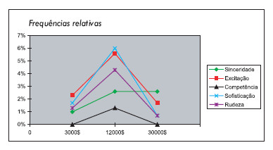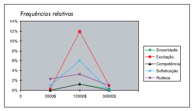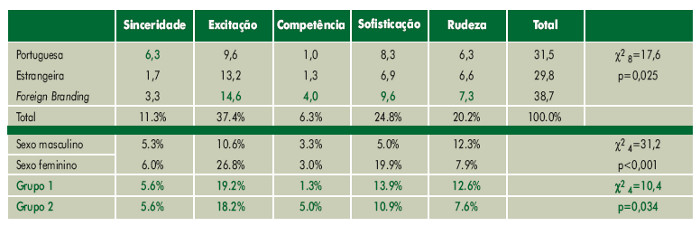 Os jovens do sexo masculino valorizaram mais as marcas competentes e do tipo rudeza, enquanto o inverso ocorreu para as marcas excitantes. Também os sujeitos líderes na adopção de novas modas (HFL) valorizam mais as marcas excitantes, competentes e sofisticadas, enquanto os sujeitos pouco sensíveis ao preço (LPS) valorizam mais as marcas sinceras com nome estrangeiro e a Terra Alta.