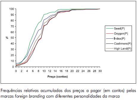 Frequências relativas acumuladas dos preços a pagar (em contos) pelas marcas foreign branding com diferentes personalidades da marca