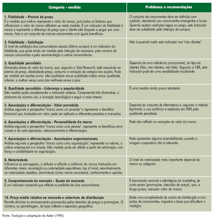 Aaker (1991) incorporou também as dimensões de atitude e comportamento, usando o multiplicador de ganhos, baseado numa média ponderada da marca em cinco componentes: notoriedade, associações, qualidade percebida, fidelidade e outros activos de propriedade industrial como patentes e marcas registadas. Por outro lado, Aaker (1996), influenciado pelo método Brand Asset Valuator da Young & Rubicam e pelo método Equitrend da Total Research, propôs um conjunto de dez medidas do valor da marca que designou por Brand Equity Ten (ver Quadro 1).