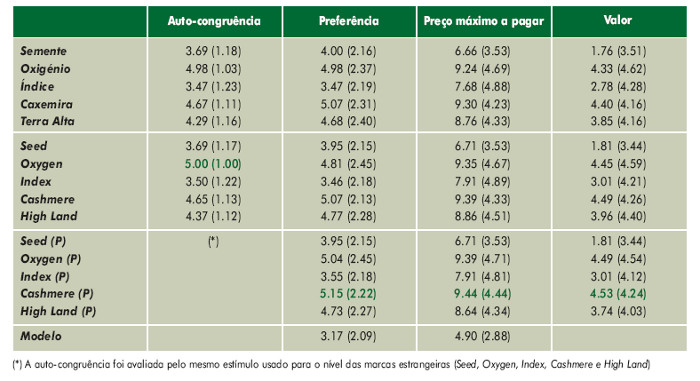 No Quadro II pode-se ver que a marca que atingiu um preço médio mais elevado foi a Cashmere (made in Portugal), enquanto no extremo oposto está a Semente, embora com um preço acima do obtido pela Modelo. Os jovens do sexo masculino estão dispostos a pagar mais pelas marcas competentes e rudes. Por outro lado, os jovens do grupo 1 estão dispostos a pagar mais pelas marcas sinceras, excitantes e sofisticadas.