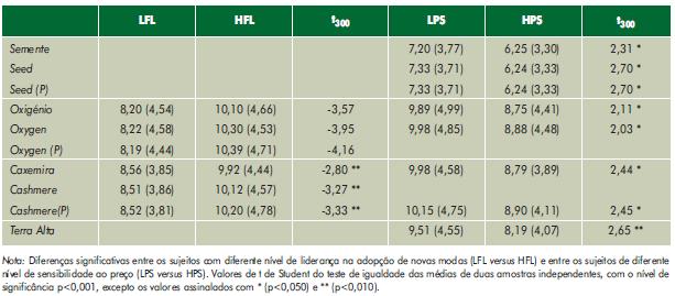 As variáveis inter-sujeitos que influenciaram o preço a pagar foram: a liderança na adopção de novas modas e a sensibilidade ao preço em interacção com a personalidade e origem. Os sujeitos foram classificados como líderes na adopção de novas modas, quando o valor da escala Fashion Leadership se situava acima da mediana, cujo valor foi igual à média, 11,0 (DP=3,6). Estes sujeitos, designados por HFL, estão dispostos a pagar mais pelas marcas excitantes e pelas marcas sofisticadas, conforme se pode ver no Quadro IV. Enquanto no mesmo quadro vê-se que os jovens mais sensíveis ao preço (HPS) estão, comparativamente com os sujeitos LPS, dispostos a pagar muito menos pelas marcas sinceras e pelas marcas excitantes, excepto a Oxygen (made in Portugal)e as marcas sofisticadas, excepto a Cashmere e a marca Terra Alta.