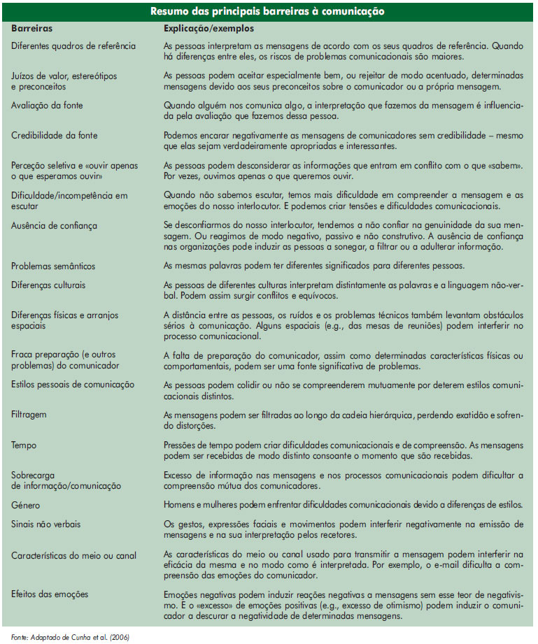 Segundo Rego (2010), é importante melhorar a comunicação de modo a poder vir enriquecer a vida tanto pessoal como organizacional. E, para que tal aconteça, é necessário compreender os elementos e obstáculos que podem «atrapalhar» o funcionamento da comunicação. Apresenta-se em caixa a descrição das barreiras à comunicação construída por Cunha et al. (2006), apresentada por Rego (2010).