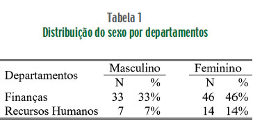 Participaram neste estudo 100 indivíduos (40% são do sexo masculino e 60% do sexo feminino), com escalão etário compreendido entre os 22 e os 52 anos de idade (µ =29,3±4,6). A média das idades em ambos os departamentos varia muito pouco, rondando os 29 anos de idade. Na Tabela 1 encontra-se a distribuição dos sujeitos por sexo e por departamento. Por motivos de confidencialidade não é mencionado o nome de todos os departamentos da empresa em estudo e optou-se por englobá-los em dois grandes ramos: Finanças e Recursos Humanos.