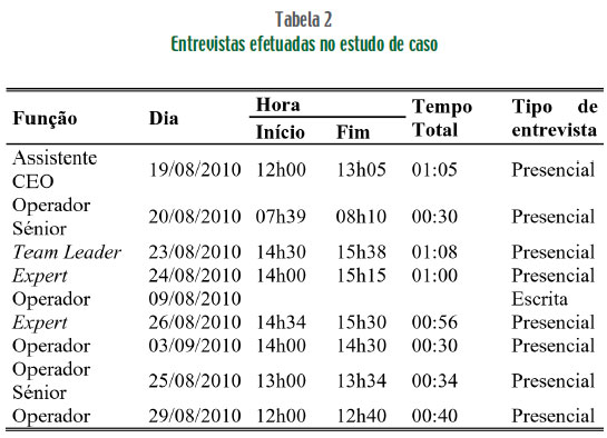Partindo do pressuposto que, para a comunicação interna ser um instrumento estratégico da gestão, é necessário o envolvimento de todas as pessoas da empresa (ABRACOM, 2008), foram selecionadas pessoas de todas as funções para a realização das entrevistas. O número limite de entrevistas foi condicionado pela disponibilidade das pessoas. Também devido à disponibilidade, pessoas envolvidas na comunicação, tais como assistentes e diretores, não puderam ser entrevistados. Apenas houve contacto informal e troca de e-mails entre o investigador e as pessoas do departamento de comunicação, nomeadamente com o diretor e assistente de comunicação. As entrevistas realizadas totalizaram 303 minutos (5,3 horas), e foram realizadas em vários níveis de hierarquia nos departamentos em estudo, como se pode ver na Tabela 2.