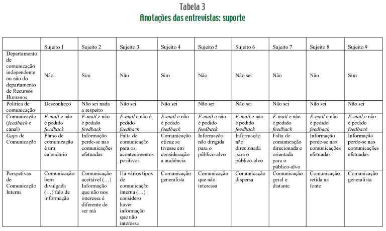 As entrevistas procuraram saber o ponto de vista dos entrevistados acerca do departamento de comunicação, política de comunicação, comunicação (feedback e canal), causas dos disfuncionamentos da comunicação e perspetivas da comunicação interna.