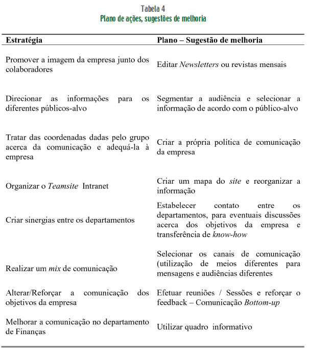 · As falhas da comunicação interna encontradas na empresa em estudo são: excesso de informação; secretismo; política de comunicação desajustada à sua realidade; ineficiência da comunicação dos objetivos, valores e missão da empresa aos funcionários; o uso do e-mail para a maioria das comunicações; filtragem e difícil pesquisa do Teamsite. Segundo Rego (2010), torna-se necessário compreender os elementos e obstáculos que possam «perturbar» a comunicação, para assim poder melhorar a vida organizacional. Deste modo, para que a empresa em estudo possa alcançar um melhor desempenho sugere-se um plano de ações (ver Tabela 4).