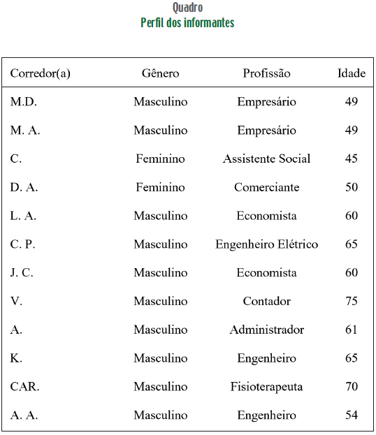Todos os informantes eram residentes da cidade do Rio de Janeiro, exerciam diferentes profissões, eram praticantes de corrida e já haviam corrido pelo menos uma maratona. A idade média dos entrevistados era de 59 anos.