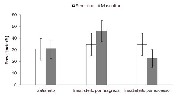 Pesquisas com universitários de diversos cursos (Quadros et al, 2010) e com acadêmicos de Educação Física (Rech, Araújo, & Vanat, 2010; Sousa, 2010) reportaram que as mulheres estavam mais insatisfeitas por excesso de peso, enquanto os homens eram insatisfeitos por magreza. O presente estudo encontrou uma tendência semelhante entre os universitários investigados; todavia, tais valores não apresentaram diferenças significantes estatisticamente entre homens e mulheres em relação ao tipo de insatisfação com a imagem corporal, pois os intervalos de confiança entre as proporções se sobrepõem (Figura 1). Isso revela que entre acadêmicos do atual estudo o tipo de insatisfação com a imagem corporal é semelhante de acordo com o sexo e que iniciativas de conscientização com o corpo por parte da instituição investigada podem ser tomadas para o combate da insatisfação por magreza ou por excesso de peso independente se os alunos são homens ou mulheres.