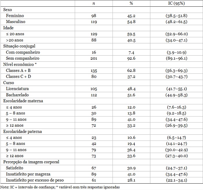 O presente estudo faz parte de um projeto de pesquisa com vários desfechos em saúde e, por isso, coletaram-se dados de 217 académicos, sendo 105 de licenciatura e 112 de bacharelado, com média de 20.6 anos de idade (DP = 0.6). A variável imagem corporal não apresentou nenhuma resposta ignorada. Dentre as variáveis independentes, o nível econômico apresentou três respostas ignoradas.