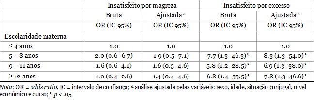 O presente estudo evidenciou que, independentemente de sexo, idade, situação conjugal, nível econômico e curso do estudante, a insatisfação por excesso de peso foi em torno de sete a oito vezes maior nos acadêmicos com escolaridade materna superior a quatro anos. A escolaridade materna está associada a comportamentos relacionados à saúde e tem impacto sobre o desenvolvimento de crianças e adolescentes por meio de fatores como organização do ambiente, expectativas e práticas parentais (Andrade, Santos, Bastos, Pedromonico, Almeida-Filho, & Barreto, 2005). Além disso, alto nível de escolaridade materna é apontado como fator de proteção contra mortalidade infantil, baixo peso ao nascer e hábitos inadequados de estilo de vida, pois influencia no desenvolvimento saudável do jovem, na extensão de vocabulário, nos escores de inteligência e no estilo de vida saudável (Andrade et al., 2005; Haidar, Oliveira, & Nascimento, 2001).