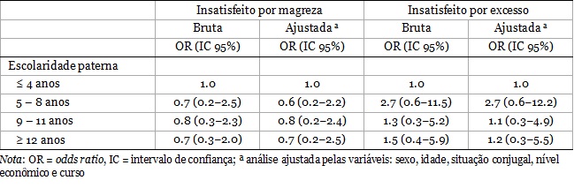 Os resultados descritos na Tabela 3 indicaram que a imagem corporal não se associou à escolaridade paterna, tanto na análise bruta quanto na ajustada.