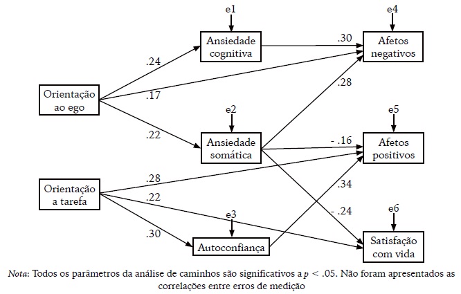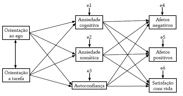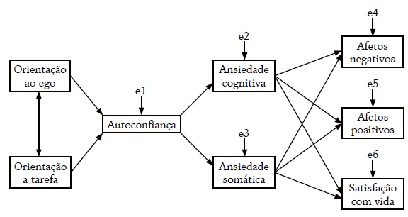 O presente estudo pretendeu investigar a relação entre orientações motivacionais, ansiedade e autoconfiança e bem-estar subjetivo (afetos positivos e negativos, e satisfação com vida) através da técnica de análise de caminhos. A amostra foi constituída por 169 atletas brasileiros (140 do sexo masculino e 29 do sexo feminino) com idades compreendidas entre os 17 e os 59 anos, de diferentes modalidades desportivas e níveis competitivos. Os questionários TEOSQ, CSAI-2, EBES e SWLS foram aplicados no dia anterior à competição, no local de treino dos atletas. Os principais resultados suportaram parcialmente o papel mediador da ansiedade e autoconfiança na relação entre orientações motivacionais e bem-estar subjetivo. Tendo em consideração índices de modificação do modelo estrutural, foram ainda especificados coeficientes de regressão entre a orientação para o ego e os afetos negativos, e entre a orientação para a tarefa e as dimensões positivas do bem-estar (afetos positivos e satisfação com a vida). Os resultados foram discutidos tendo em contas as implicações teóricas e práticas destas relações.