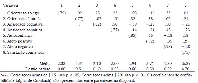 De um modo geral, as correlações obtidas estão de acordo com as hipóteses teóricas. A correlação não significativa entre a orientação para o ego e para a tarefa suporta a ortogonalidade conforme o argumento de Nicholls (1989). A orientação para o ego associou-se positivamente com a ansiedade cognitiva, a ansiedade somática e os afetos negativos, e negativamente com os afetos positivos. A orientação para a tarefa correlacionou-se positivamente com a autoconfiança e as dimensões positivas do bem-estar. A ansiedade cognitiva correlacionou-se positivamente com a ansiedade somática e afetos negativos, verificando-se correlações negativas com a autoconfiança, afetos positivos e satisfação com a vida. A ansiedade somática relacionou-se positivamente com os afetos negativos e negativamente com as dimensões positivas do bem-estar. A autoconfiança associou-se positivamente com os afetos positivos e satisfação com a vida e negativamente com afetos negativos. As relações entre as dimensões do bem-estar subjetivo confirmaram os pressupostos teóricos.
