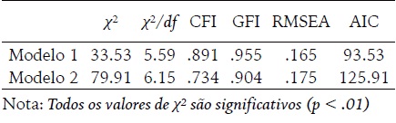 Dessa forma, após a especificação e estimação dos modelos, a sua adequação foi avaliada por um conjunto de índices de ajustamento/adequação. O valor de X2 (Qui-quadrado) indica ajustamento quando o valor não é significativo (p > .05). No entanto, esse teste é sensível ao tamanho da amostra, ou seja, em amostras numerosas o valor tende a ser significativo, embora o modelo possa estar ajustado aos dados. Jöreskog e Sörbom (1989) sugeriram uma razão do Qui-quadrado pelos graus de liberdade (df), representado por X2/df, pelo que Ullman (2001) sugere valores abaixo de 2.0 como aceitáveis. Adicionalmente, foram utilizados os seguintes índices de ajustamento: a) CFI (Comparative Fit Index ) e GFI (Goodness Fit Index) podendo os seus valores variar de 0 a 1. Segundo Bentler e Bonnet (1980), valores acima de .90 representam um ajuste adequado para o modelo. Mais recentemente, Hu e Bentler (1999) sugeriram um ponto de corte de .95 como indicativo de um bom ajustamento do modelo; b) RMSEA (Root Mean Square Error of Approximation), em que valores menores que .08 indicam uma adequação aceitável (Browne & Cudeck,1993), embora Hu e Bentler (1999) tenham sugerido um ponto de corte de .06; e, c) AIC (Akaike Information Criterion) que indica a parcimônia e simplicidade do modelo através do menor valor entre os modelos testados.
