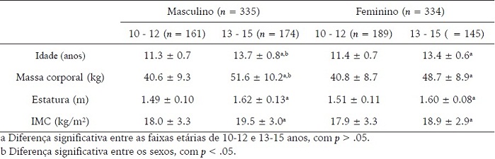 Os valores médios e o desvio padrão das variáveis antropométricas (massa corporal, estatura e IMC) e da idade estão descritos na Tabela 1. Foram verificadas diferenças significativas (p < .05) entre as faixas etárias de 10 a 12 anos e de 13 a 15 anos, em todas as variáveis analisadas, independentemente do sexo. Nas comparações entre os sexos, verificou-se que os rapazes apresentaram médias de idade e massa corporal superiores aos seus pares do sexo feminino somente na faixa etária entre 13 e 15 anos.