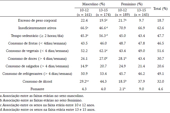 Na análise das diferenças entre os sexos, foi demonstrado que nos escolares com idades entre 10 e 12 anos, os rapazes apresentam maior consumo de bebidas alcoólicas (X2 = 5.522; p < .05), enquanto as moças tiveram maior proporção de consumo excessivo de salgados (X2 = 5.289; p < .05). Na faixa etária entre 13 e 15 anos, os rapazes apresentam maior proporção de excesso de peso corporal (X2 = 6.046; p < .05), de tempo sedentário superior a duas horas por dia (X2 = 5.244; p < .05) e do baixo consumo de vegetais (X2 = 5.514; p < .05), quando comparados às moças. Por sua vez, o percentual de insuficientemente ativos (X2 = 13.273; p < .05) e do elevado consumo de doces (X2 = 9.458; p < .05) foram superiores nas meninas em comparação aos rapazes. O baixo consumo de frutas e o elevado consumo de refrigerantes apresentaram proporções semelhantes entre os sexos e as faixas etárias (p > .05).